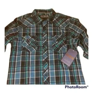 Mens M button down shirt with roll up sleeves is NWT. Cotton polyester blend, two pockets and nice stitching. Blue plaid. 29" shoulder to hem, 20" armpit to armpit and 25" shoulder to cuff of sleeve.