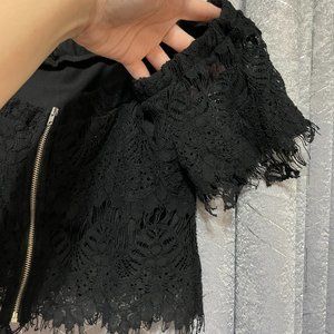 Black lace crop top, with an opaque under layer in some spots but the see-through lace extends down past it to give it a sheer feel, when paired with high-waisted pants or skirts the lace will cascade down over the bottoms. Off-the-shoulder lace sleeves & spaghetti straps (which could be tucked in or removed if desired when wearing it off-the-shoulder).
