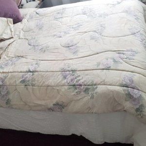 A reversible Twin bed Comforter from The Bay. Larger lavender and beige Floral pattern front, small lavender Floral pattern back. Comes with 1 large pillow case.