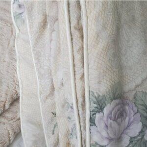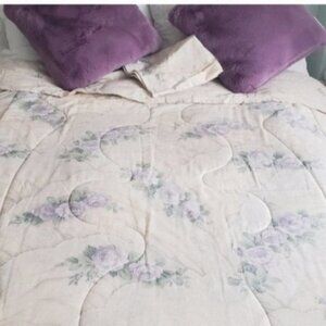 A reversible Twin bed Comforter from The Bay. Larger lavender and beige Floral pattern front, small lavender Floral pattern back. Comes with 1 large pillow sham not two- First photo shows 2 pillow shams for photo set up.