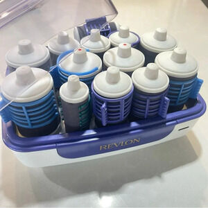 Revlon RV-258 hot rollers, flocked cool-touch curlers, Revlon 12-piece curling set, hot rollers with clips, used Revlon hair curlers, voluminous hair curlers, Revlon RV-258 styling tools, professional hair rollers.