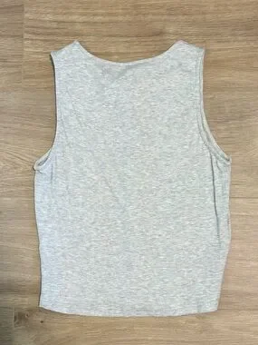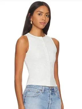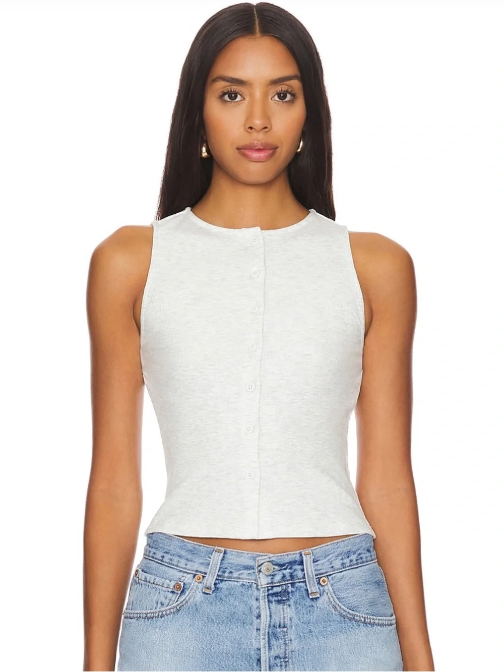 Sleeveless ribbed tank with a crew neckline. Button-front detail down center. Fitted silhouette with slight crop. Soft, heathered fabric.