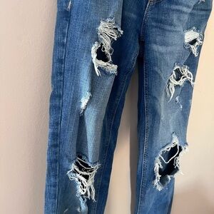 Distressed denim with a hello kitty patch on the left side of the back. In preloved condition: