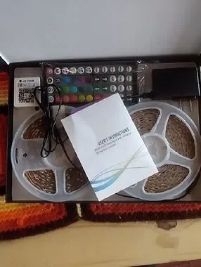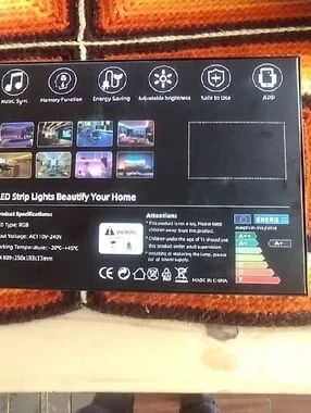Multicolor LED strip lights with RGB glow. Flexible strips with bright color changing LEDs. Includes packaging artwork and icons for features. There is 10 feet and are brand new.