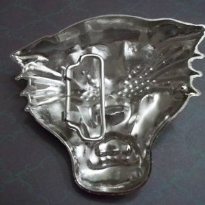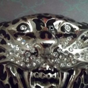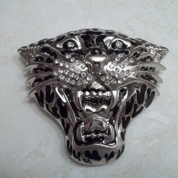 Stunning Leopard with Rhinestone belt buckle. Large belt buckle with high shine silver and black snarling Leopard face with stunning rhinestone highlighting the leopards eyes and whiskers. Raises from the waistline belt by approximately 1 inch .Made from high quality metal alloy. Measures approximately 3.75 inches x 4.25 inches. Can accommodate 1- 1.5 inch snap belt. New without tags
