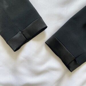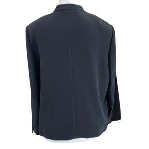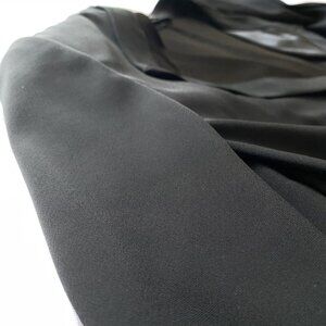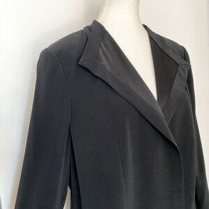 RIANI BLACK FLOWY OPEN BLAZER WITH POINTED COLLAR, this is a flowy silky acetate blend black blazer featuring long sleeves with regular shoulder pads for a structured touch on a soft shell blazer - regular length (shorter than longuer) - open front with an interesting pinned peak collar detailing - perfect classic contemporary mature blazer for work or any formal serious conservative event over a sheath dress or with a dress pants. Versatile and a wardrobe staple.