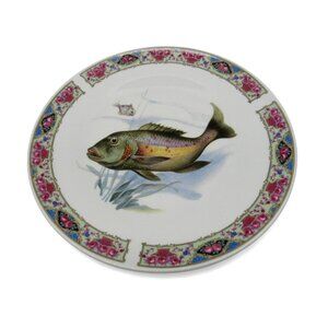 This rare set of ceramic plates by Richard Ginori showcases vivid fish illustrations complemented by ornate floral borders.