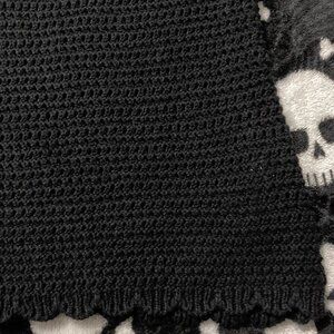 Highlights include a somewhat open weave design, wide scoop meets rounded square neckline, short (cap) sleeves, scalloped edges throughout, and a relatively loose cut. Swoon!!!🖤😍