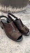Reiker sling back sandals in brown patent leather with a snakeskin pattern. Open toe. Adjustable strap with a fancy silver tone metal buckle. 2" heel.