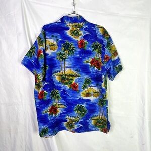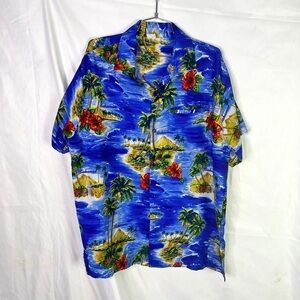 RINA HAWAIIN BUTTON DOWN SHIRT BLUE SHORT SLEEVE PALM TREE BEACH VTG MEN LARGE