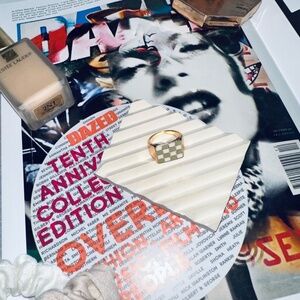 Pistachio Green and White Checkered Square Shaped Ring Gold Colored