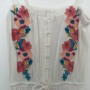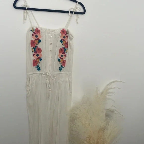 RIPCURL jumpsuit. Small. Used, like new. Only worn twice. White with embroidered florals. Adjustable tie straps.
