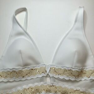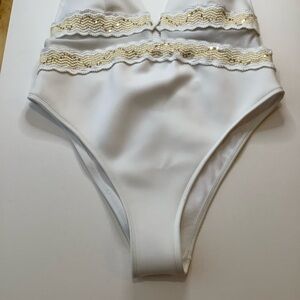 River Island elegant white swimsuit with gold and sequin embroidered accents. Perfect for a chic beach day.