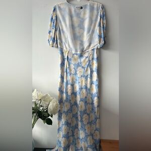 Charming maxi dress with bold floral print. Features a deep V-neck and short sleeves. Ideal for a stylish outing