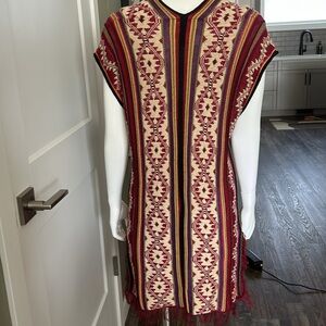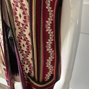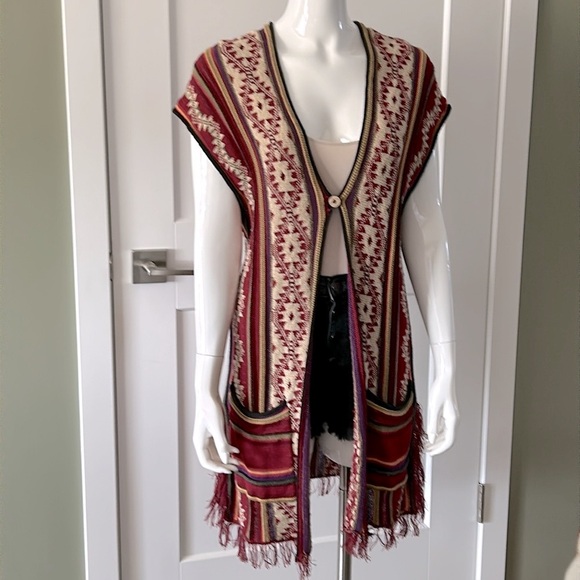 2 front pockets. Split hem at sides. 1 button closure. Fringe hem.
