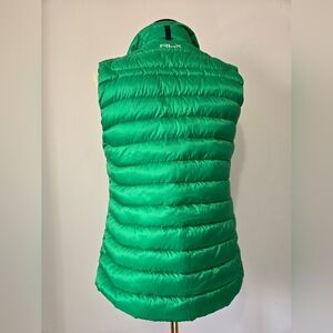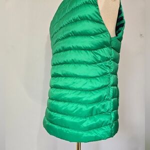 Reversible down puffer vest in green and navy stripes. Waterproof, windproof, and packable with a handy travel bag. Two front pockets on the striped side. Material information available in the pocket. Incredibly lightweight and packable.