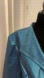Long sleeved, V-Neck, Shiny teal/green/blue V-Neck jacket/top/blazer. Top has shimmery small beads in various sizes on the Collar. Front closure of jacket has side ruching with black shiny round buttons. Jacket has medium size shoulder pads Back of jacket also has a long zipper closure in back.