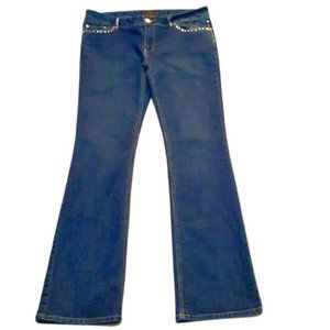 Features rhinestones on the pockets & belt loops, floral design decorates pockets & waist band, boot cut leg, 5 pockets, mid-rise range.