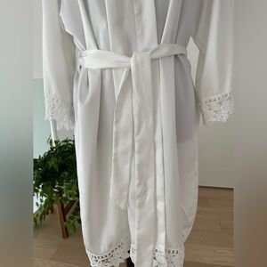 Flowy short soft white robe has an interior tie and a tie belt. There is lace trim on the cuffs and hem in a floral pattern. No brand or material tag, I would say polyester, it feels like a silky fabric that is a little bit sheer as shown in photos.