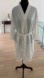 Flowy short soft white robe has an interior tie and a tie belt. There is lace trim on the cuffs and hem in a floral pattern. No brand or material tag, I would say polyester, it feels like a silky fabric that is a little bit sheer as shown in photos.