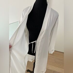 ROBE Flowy Short Length Tie Waist White Floral Lace Trim Sheer Loungewear