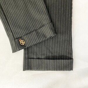 ROBERTO CAVALLI BLACK PINSTRIPES BLUE VELVET WAISTBAND DRESS PANTS, this is a classic vintage designer Robert Cavalli black grey minestripes cuffed tapered leg high rise pants with an interesting original one of a kind azure blue velvet waistband for a fashionnable contrast and mix of style - metallic stitched logo on the front right side - slash pockets - zipper fastening with one hook-and-bar closure- unlined - stretch and comfy yet sleek and classic - timeless with a modern touch. Business to party with oxfort shoes or heels.