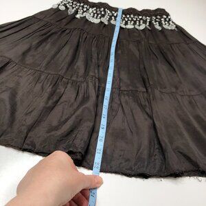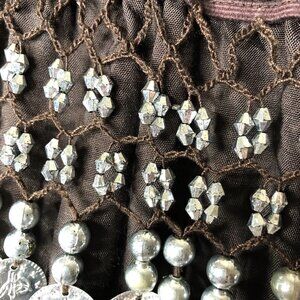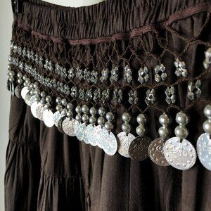 Rock & Rose brown broomstick style tiered skirt with beading & metallic “coins” near the top band which makes it perfect for belly dancing. Great for that boho, hippie, Gypsy, chic vibe & for costumes. It has an elastic waistband and is very stretchy. Keep that in mind when looking at the measurements. In excellent used condition all over expect its missing one set of coins and beads on one of the sides (not very noticeable when on because of its placement and constant movement). The bottom hem is distressed. Please see photos for measurements and details. Women’s size MEDIUM.