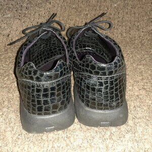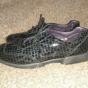 Gorgeous shoes that make a statement. Leather in a patent and textured crocodile pattern laced with some contrast color.