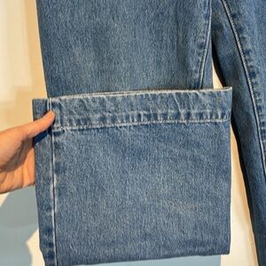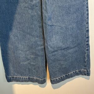 Stylish high rise jeans. Classic blue denim. Wide leg design. Perfect for casual wear.