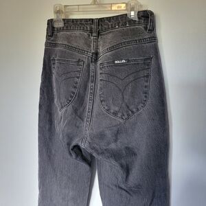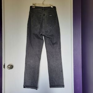 Ultra comfy and cool charcoal jeans with a straight leg design, and high waist. Nice thick denim construction, these are in great condition. Teeny tiny white spot on one knee, as pictured.
