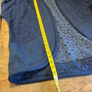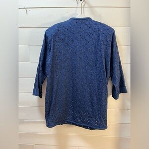Beautiful vintage jacket made in Canada by Roni Blanshay Montréal. Deep indigo blue cotton blend with delicate floral eyelet embroidery and soft shoulder pads for a structured silhouette. Features an open curved front, ¾ sleeves, and side pockets. A timeless and elegant piece with refined craftsmanship.