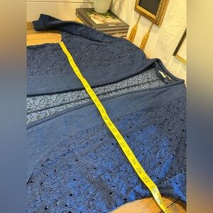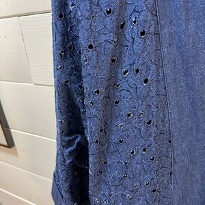 Superbe veste vintage fabriquée au Canada par Roni Blanshay Montréal. Tissu bleu indigo orné de broderies ajourées florales, avec épaulettes souples pour une belle structure. Ouverture arrondie à l’avant, manches ¾ et poches latérales. Une pièce élégante et intemporelle au charme raffiné.