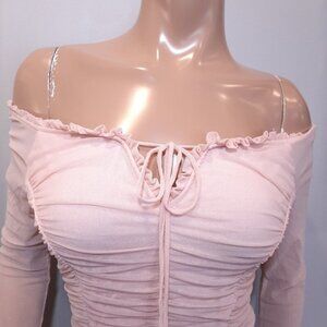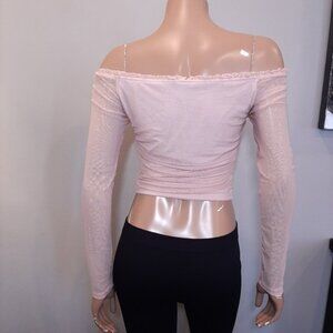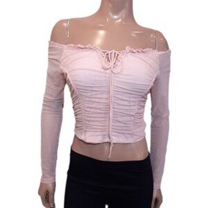 ROOM SERVICE Off Shoulder Crop Top Sheer Long Sleeve Ruched Mesh Womens Large