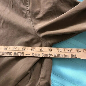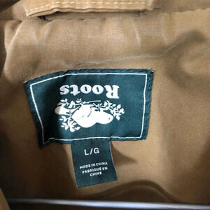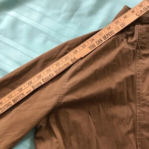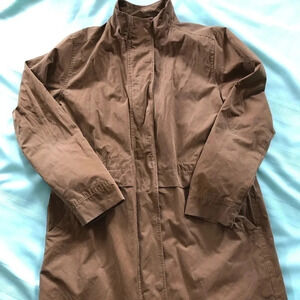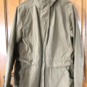 Camel coloured three season jacket. Sturdy black zipper in the front and snap up buttons, elastic drawstring inside at the waist makes this perfect for adjusting to multiple body types.