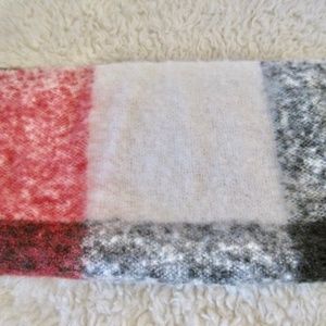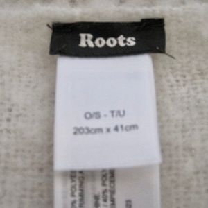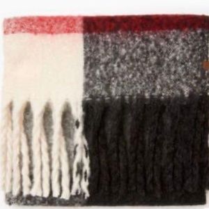 Roots Cabin Fluff Scarf. Color: Black/Red/White. SIZE: T/U .Inspired by their signature cabin stripe, the Roots cabin fluff scarf features an oversized pattern in a lightweight yet cozy design. Features: