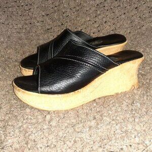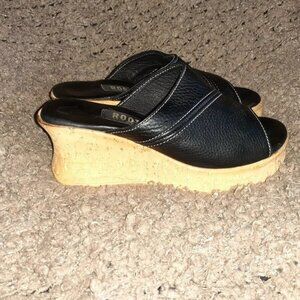 Classic tribe leather Roots Canada black slides with 2.5" cork platform wedge heel.