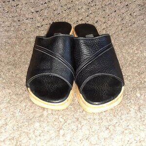 ROOTS Canada-Black Tribe Leather Slides-Cork Wedge Sandals-Mules-Sz 37-Excellent