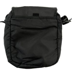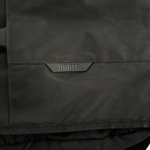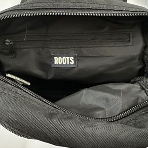 ROOTS Crossbody Bag Black Nylon Buckled Flap Lots of Pockets Back Pouch