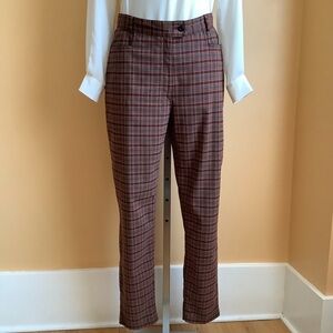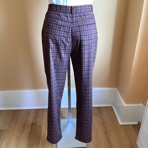 These Roots dress pants feature a checker print plaid pattern in grey and orange tones, offering a tailored fit. Crafted from a structured fabric, they present a high-waisted design with a full-length, straight-leg silhouette.