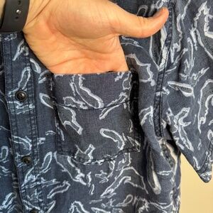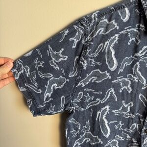 ROOTS Men's M 100% Linen Allover Lakes Print Button Up Shirt Blue Summer Resort