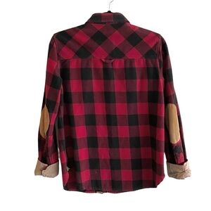 ROOTS Red Black Checked Plaid Flannel Button Front Shirt Elbow Patches S