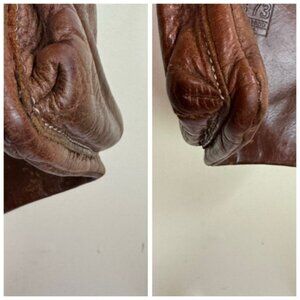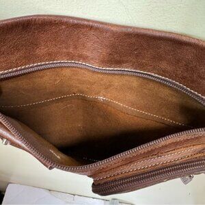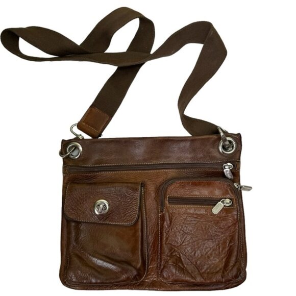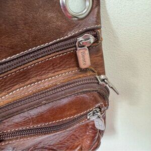 ROOTS Vintage Village Tribe Leather Brown Crossbody Shoulder Bag Pockets Logo