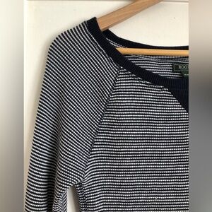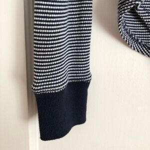 Roots Canada textured navy blue & white striped body hugging T-shirt. Long sleeve with ribbed cuffs.