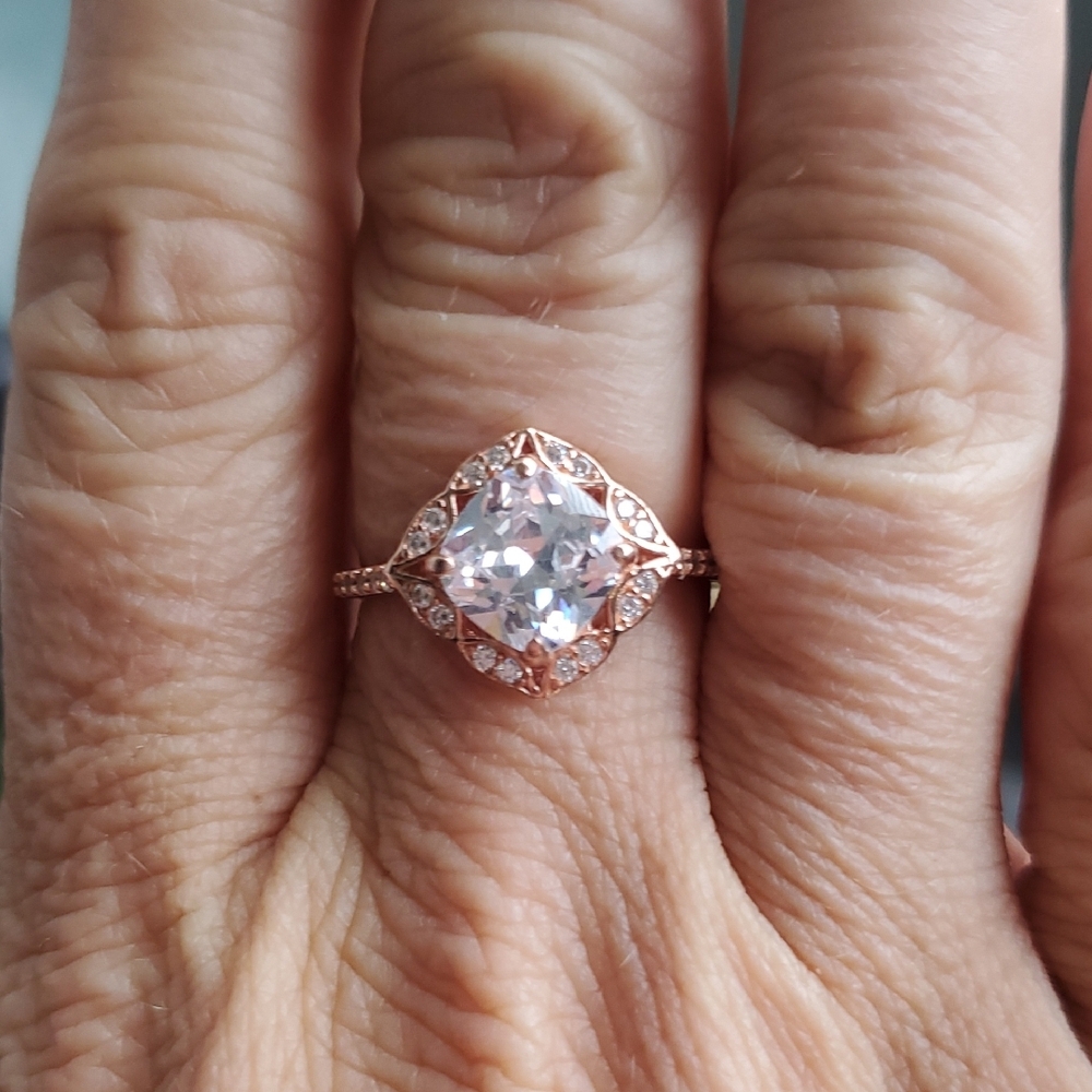 Elegant 925 stamped sterling silver with rose gold overlay. This stunning ring has a large unique diamond centerpiece. Perfect for adding a touch of luxury to any outfit.