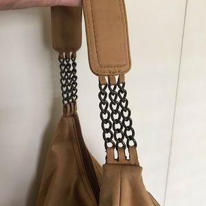 Slightly used in good condition w/two zippered pockets, chain straps. There’s no rips, but does have a tiny faded ink spot below the inside pocket that’s hard to see. **BONUS: receive an unused mystery gift with purchase**