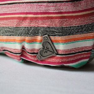 Fabulous Roxy Girl shoulder bag/handbag/purse in like new condition. Braided handle and multi colored stripe cotton fabric (red, green, orange, teal, white). Zippered closure with smaller zippered pocket inside. Small but very roomy for all the essentials and maybe a snack or two! Pre-owned but like new condition with plastic tag still attached. Smoke-free, pet friendly home!