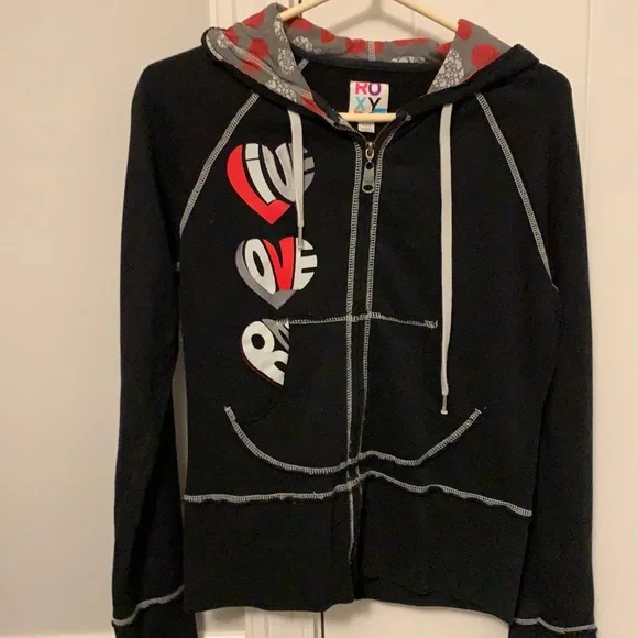 Grey & red “Live Love” print (V & L are stitched) on the front. Heart printed fabric on hood & heart prints on left sleeve.