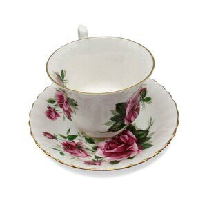 This Royal Albert bone china set features a delicate pink rose pattern, accentuated by gold trim.