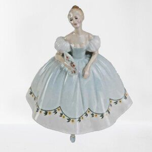This elegant and charming lady is dressed in a flowing baby blue and white gown, ready for the first dance of the evening. Her dress features puffy white sleeves and a white hem trimmed with a delicate garland of yellow flowers and green foliage. In her right hand, she holds a graceful fan adorned with softly shaded red and yellow rose blossoms. A dainty toe peeks out from beneath her swirling gown—a signature detail of Royal Doulton’s Pretty Ladies series.