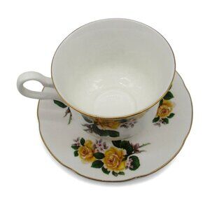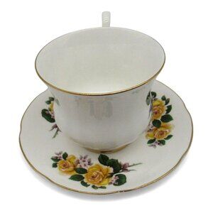 This Royal Grafton teacup and saucer set, crafted in England, features a delicate yellow rose motif.